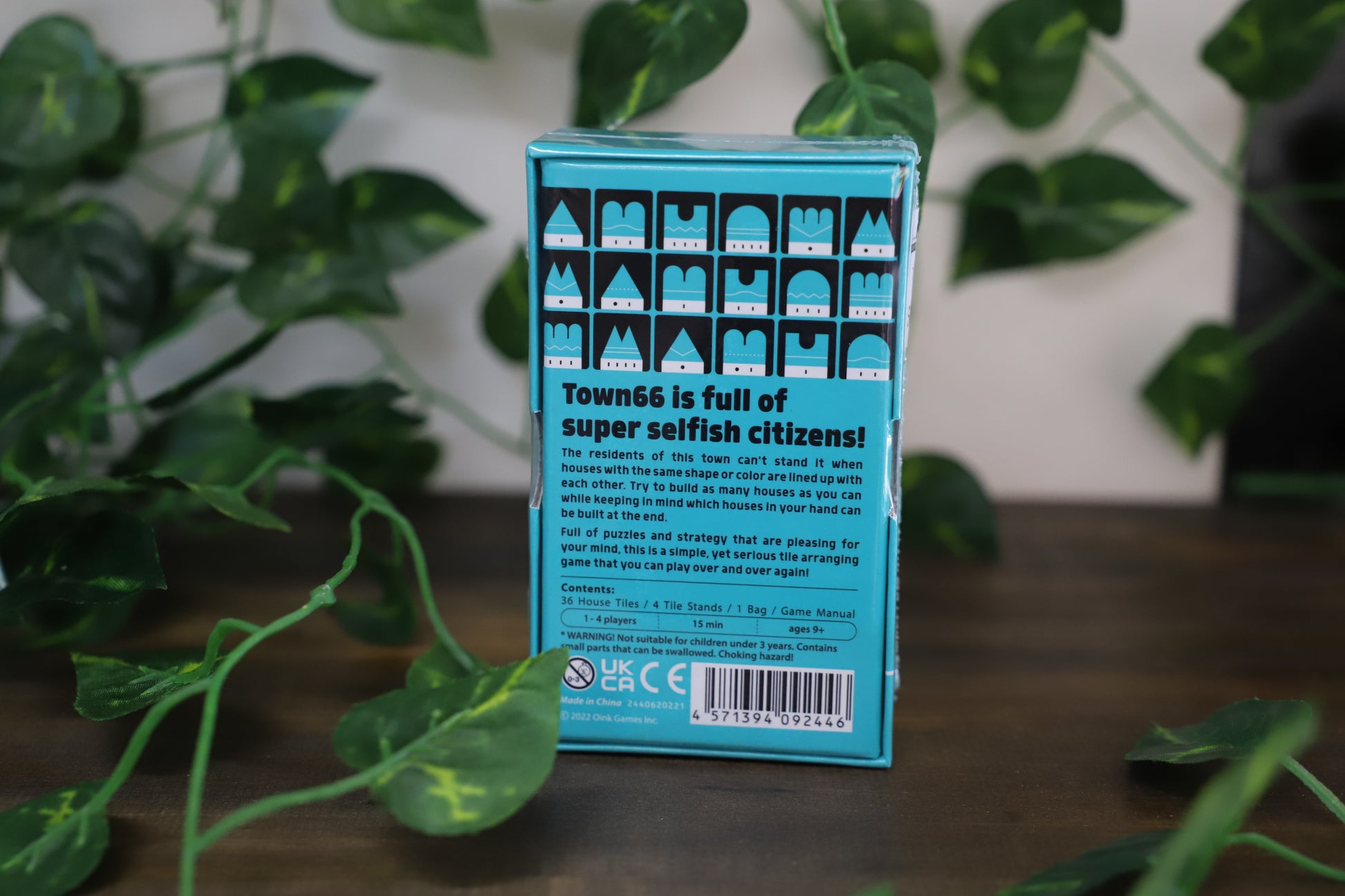 In Town 66, each player has a hand of tiles, with each tile showing one of six house styles in one of six colors/patterns. (The color/pattern of a tile also shows on its reverse side.) The game has 36 tiles in total, one of each possible combination.