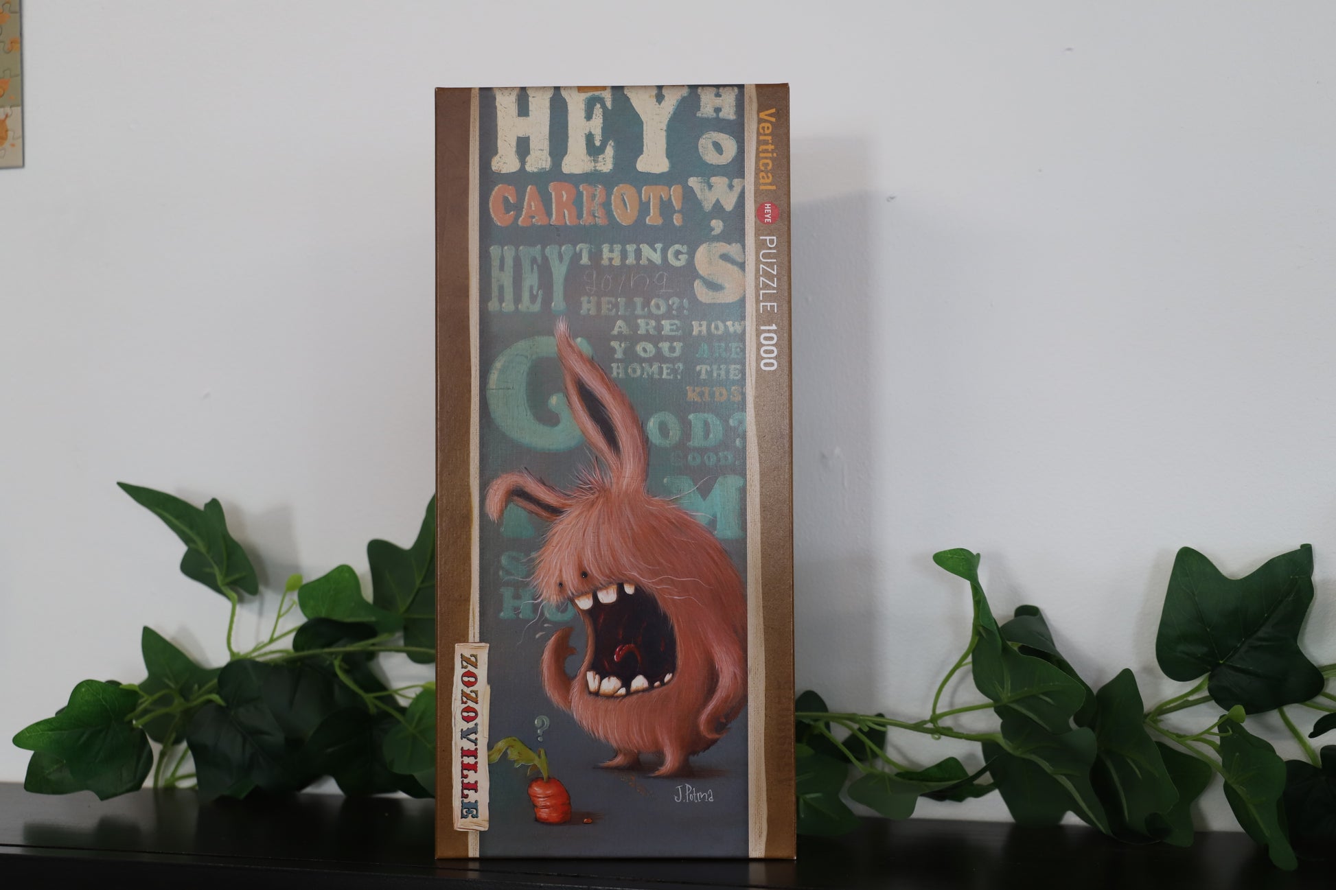 Gorgeous monster simply confused by the carrot, cutest puzzle! 1000 pieces, vertical puzzle, 33 x 95 cm when finished.