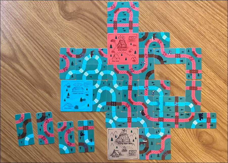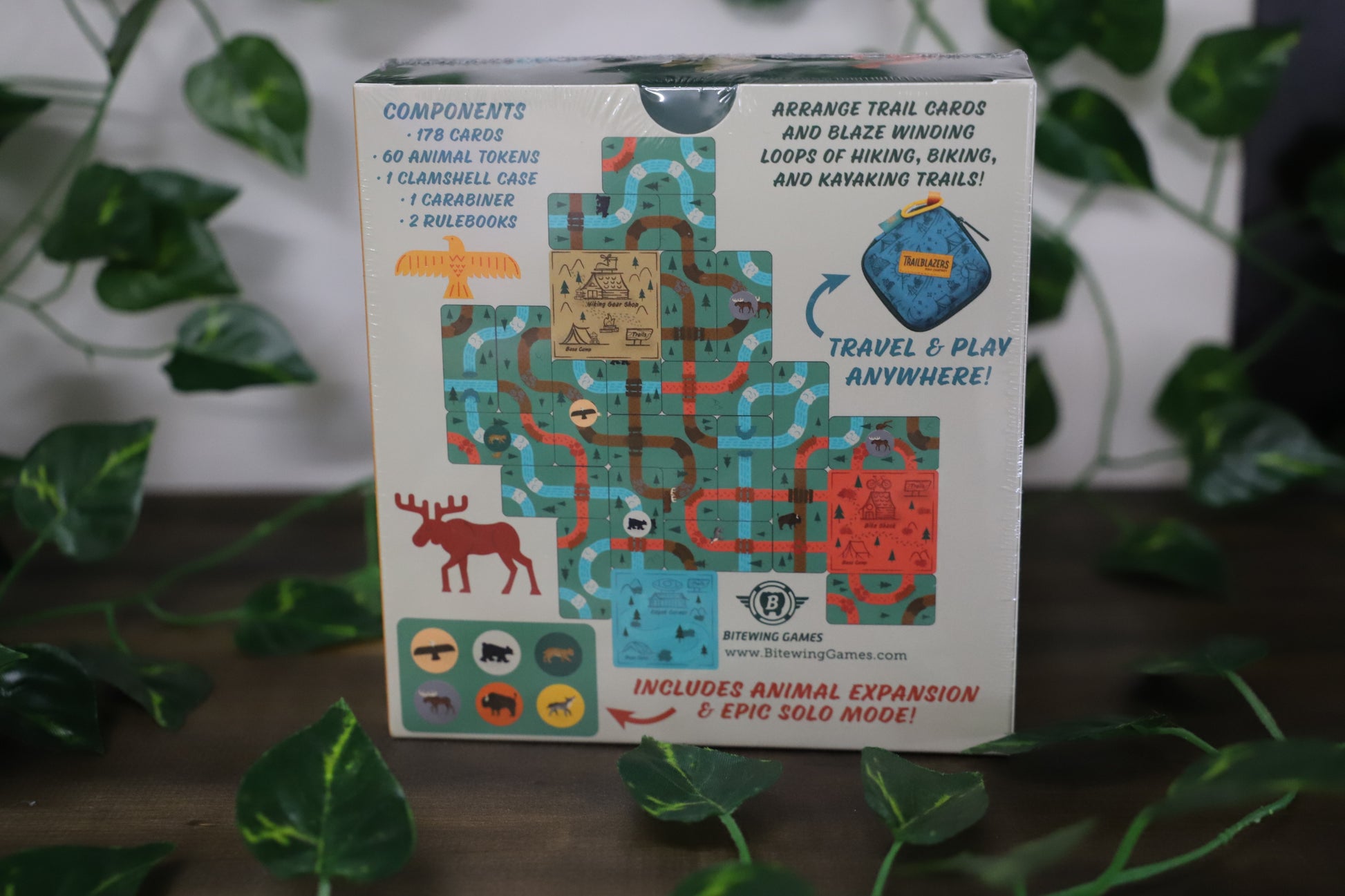 In Trailblazers, players compete to earn the most points by building biking, hiking, and kayaking loops from their campsites of the matching trail type. Each round, players are dealt eight trail cards where they’ll draft two cards, arrange those cards in their personal area, and pass their hand to the next player three times. Cards must either be placed adjacent to or overlapping other cards. While players can push their luck by aiming to construct long and elaborate trails, only closed loops that start and end at a matching campsite will score points. Players also compete to fulfill “In Game” and “End Game” goal cards. After four rounds, the game ends and the player with the most points from closed loops and goal cards wins.